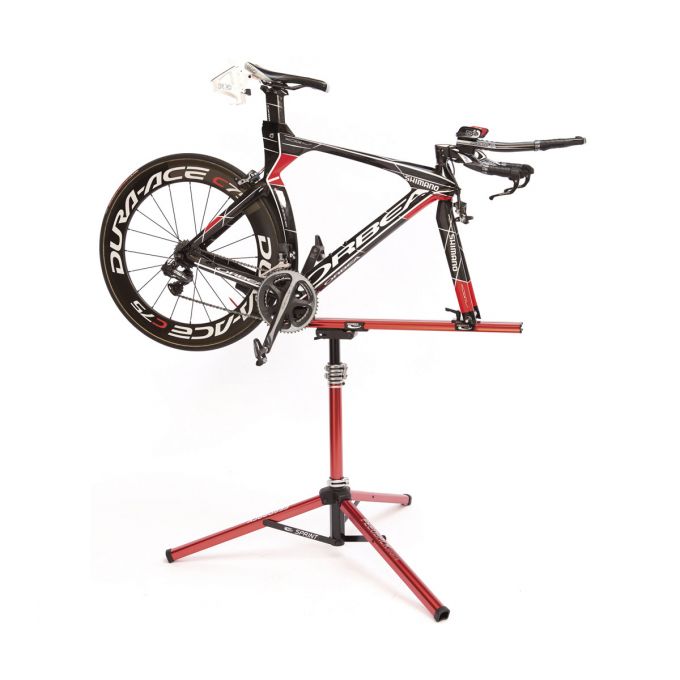 Navrhnutý tak, aby bol najkompaktnejším a najstabilneším montážnym stojanom s uchytením za vidlicu.Nastaviteľná výška od 76 do 122 cm. Jednoduchý rýchloupínakový držiak vhodný na všetky rozmery vidlíc. Možnosť otáčania o 360°.