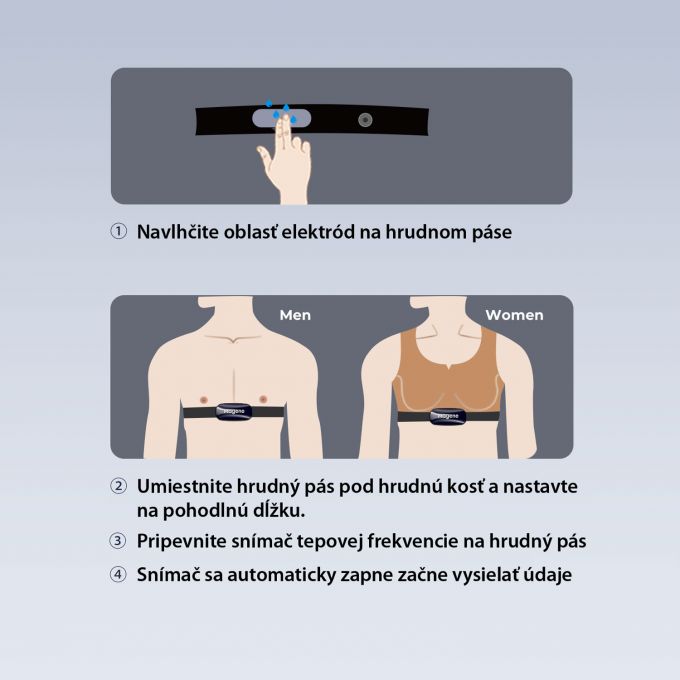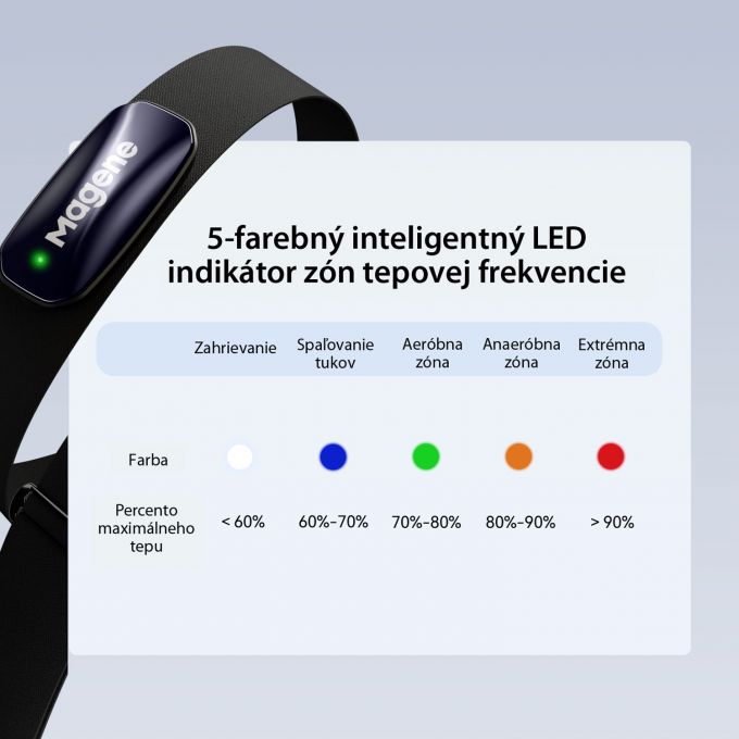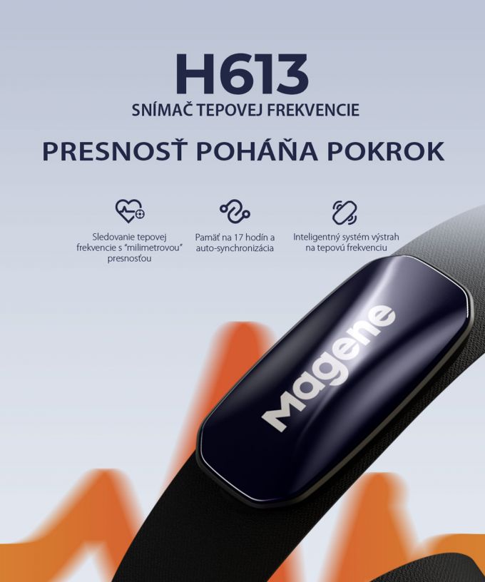 Magene H613 je profesionálny hrudný snímač srdcovej frekvencie s optickým PPG senzorom, LED indikáciou tréningových zón, výdržou batérie až 100 hodín a unikátnou možnosťou zaznamenávať tréningy bez nutnosti pripojenia k zariadeniu (offline pamäťou). Vďaka podpore Bluetooth 5.0 a ANT+ je kompatibilný s väčšinou moderných aplikácií a cyklopočítačov.________________________________________Offline záznam tréningu až 17 hodínMagene H613 umožňuje nezávislé ukladanie tréningových dát priamo do pamäte zariadenia. To znamená, že si môžete užiť beh, cyklistiku či iný šport aj bez telefónu alebo hodiniek – dáta sa automaticky uložia a neskôr ich jednoducho synchronizujete cez aplikáciu.Výhody:• Trénujte bez mobilu či hodín• Žiadne výpadky spojenia• Dáta sa po synchronizácii uložia do aplikácie Magene Utility alebo ďalších podporovaných platforiem________________________________________LED indikácia zón tepu – kontrola v reálnom časeFarebný LED pás na prednej strane pásu vizuálne zobrazuje, v akej zóne srdcovej frekvencie sa aktuálne nachádzate – bez potreby sledovania displeja.Zóna Farba % z max. HR ÚčelZóna 1 Biela <60 % RegeneráciaZóna 2 Modrá 60–70 % Spaľovanie tukovZóna 3 Zelená 70–80 % Zlepšovanie kondícieZóna 4 Oranžová 80–90 % Anaeróbna výkonnosťZóna 5 Červená 90–100 % Maximálny výkon________________________________________Batéria na 100 hodín tréningu• Výdrž batérie: až 100 hodín aktívneho používania• Nabíjanie cez USB-C – rýchle a praktické• Kapacita: 160 mAh• Plné nabitie za približne 1,5 hodiny________________________________________Bluetooth a ANT+ protokoly Univerzálne pripojenie umožňuje pripojenie až k trom zariadeniam naraz – napríklad k cyklopočítaču, hodinkám, trenažéru alebo telefónu a Zwiftu.Kompatibilné s:• Aplikácie: Zwift, Strava, Rouvy, TrainerRoad, Komoot, Wahoo, Elite a ďalšie• Zariadenia: Garmin, Wahoo, Suunto, Polar, iGPSPORT, Coros, Bryton________________________________________Magene Utility App – váš tréning pod kontrolouV aplikácii môžete:• Nastaviť HR zóny a farby LED indikácie• Synchronizovať offline tréningy• Kontrolovať stav batérie• Aktualizovať firmware zariadenia• Vizualizovať reálny časový záznam tepu________________________________________Ergonomický a pohodlný popruh• Materiál: protišmykový, mäkký, elastický a priedušný s antibakteriálnou/protizápachovou úpravou• Rozsah: 75 – 100 cm• Odolnosť voči vode: IPX7 – pot, dážď ani sprcha nie sú problém• Hmotnosť: iba 54 g vrátane popruhu________________________________________Balenie obsahuje:• Hrudný snímač Magene H613• Elastický nastaviteľný popruh• USB-C nabíjací kábel• Používateľský manuál________________________________________Technické parametreFunkcia HodnotaSenzor Optický PPGPamäť 17 hodín offline záznamuKonektivita Bluetooth a ANT+Výdrž batérie 100 hodínNabíjanie USB-C (cca 1,5 h)Vodeodolnosť IPX7Zóny tepu 5 (LED indikácia)Hmotnosť 54 g (s popruhom)Kompatibilita iOS, Android, Garmin, Zwift, atď.Rozmery: 61,1 x 28,9 x 10,8mm