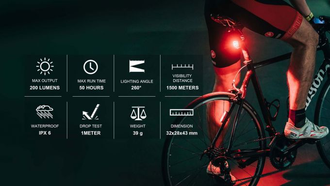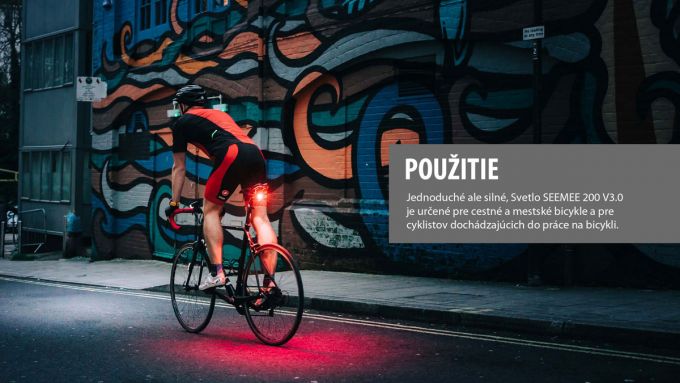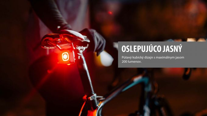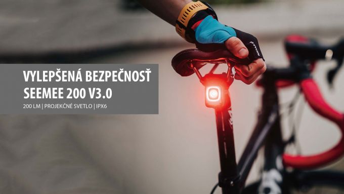 SEEMEE 200 V3.0 je úplne nová vylepšená verzia predchádzajúceho modelu SEEMEE 200 a jedno z najvýkonnejších zadných svetiel na trhu. Extra výkonné a pútavé zadné svetlo s elegantným dizajnom v tvare kocky, ktorého maximálny výkon môže dosiahnuť až 200 lm. SEEMEE 200 Je vybavený až dvomi šošovkami: hlavným svetlom a pod ním umiestneným tzv. "sledovacím svetlom". Funkcia OptiTracing premieta 360-stupňový oblúk červeného svetla na cestu, čím výrazne zvyšuje efekt výstrahy. Vďaka priesvitnému krytu vrhá hlavná šošovka 260-stupňový lúč, ktorý dostatočne osvetlí cestu aj pri odbočovaní. Stlačením a podržaním tlačidla zapnete alebo vypnete svetlo a krátkym stlačením vyberiete medzi rôznymi jasmi a režimami. Chceli by ste niekedy jazdiť s priateľmi dlhší čas? SEEMEE 200 vám to v novej verzii umožní s režimom blesku pre skupinovú jazdu, ktorý vyžaruje iba 10 lm a poskytuje až 50 hodinovú výdrž. Okrem toho sme nanovo definovali aj inteligentný režim, s ktorým môžete počas dňa používať maximálny výkon 200 lm, čo výrazne zvyšuje bezpečnosť jazdy počas dňa. Max výkon 200 lm, 360° sledovacie svetlo, snímač pohybu, snímač jasu, IPX6, super jednoduché ovládanie a dlhšia doba prevádzky robia zo SEEMEE 200 V3.0 jedno z najlepších zadných svetiel na svete.Max výkon: 200 lm; Max. prevádzkový čas: 50 hod; Doba nabíjania: 1.5 hod (5V 1A); Batéria: 3.7V 1000mAh; Viditeľnosť: 260°; Vzdialenosť: 1500 m; Nabíjačka: micro USB; Vodeodolnosť: IPX6; Systém upevnenia: Quick-release popruh; Rozmery: 32x28x43 mm; Váha: 39 g